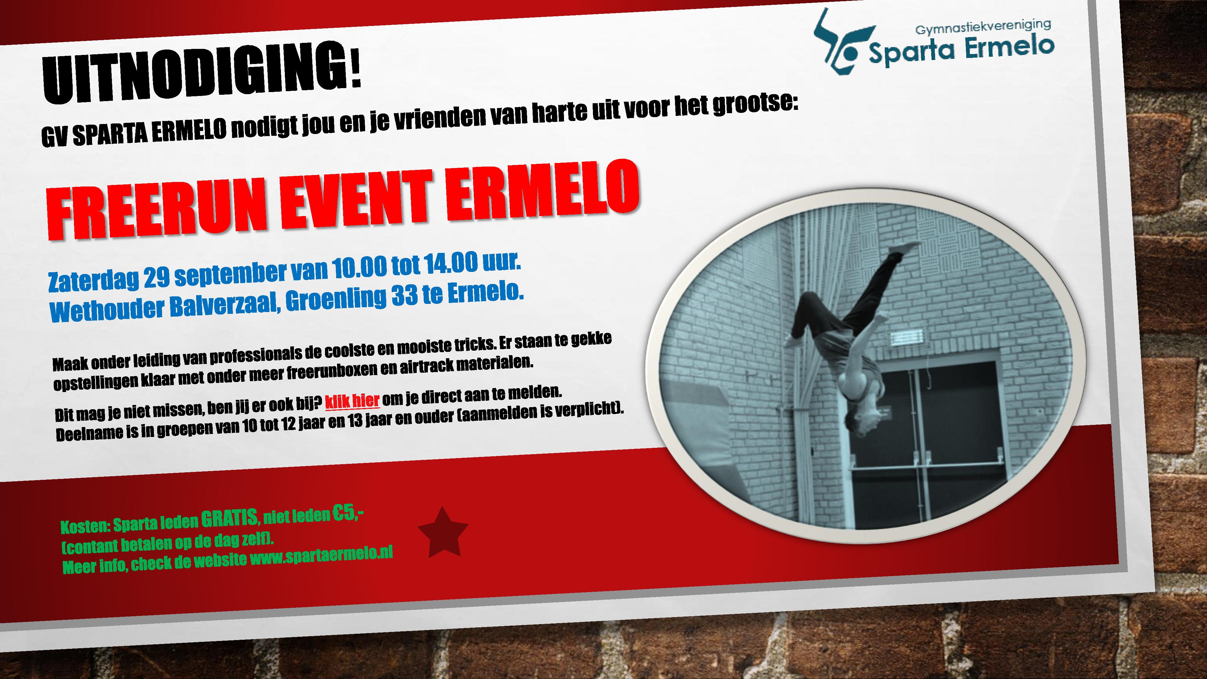 Op zaterdag 29 september zal de Wethouder Balverszaal in Ermelo omgetoverd worden tot Freerun Plaza. Freerunners van Sparta Ermelo en van andere clubs uit de regio kunnen zich aanmelden voor dit evenement. Sparta kijkt uit naar deze sportieve ontmoeting en roept ook de eigen Ermelose jeugd, vanaf 10 jaar dat nog niet aan freerunning doet, zich aan te melden.