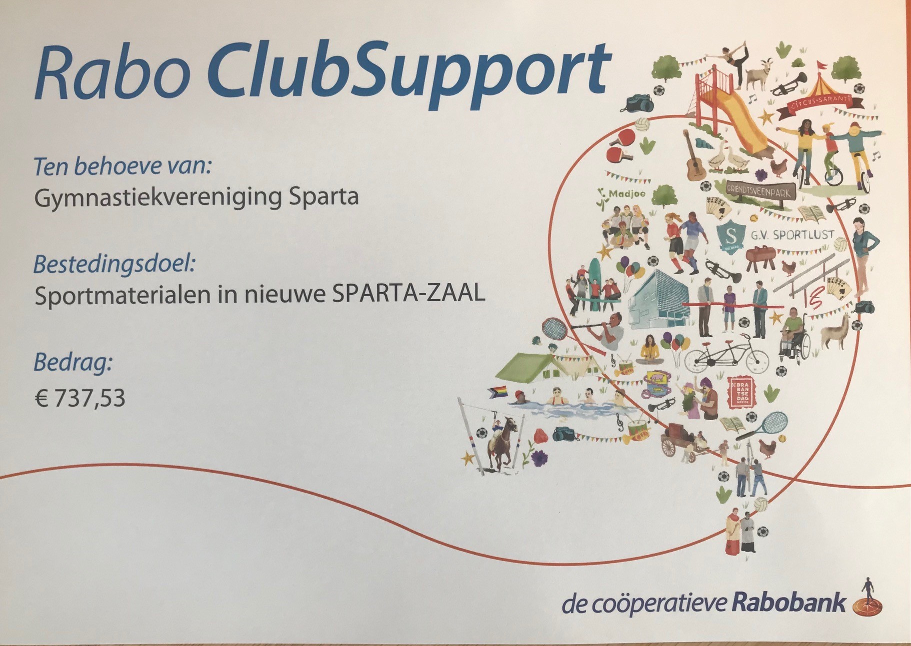 De leden (tevens klanten) van de Rabobank mochten daarvoor stemmen op drie verenigingen. SPARTA had zich evenals vorig jaar vooraf verenigt met Dindoa Korfbal en EFC”58 voetbal. Dat leidde tot een opbrengst van € 737,53 dat SPARTA gaat besteden aan sportmaterialen in de nieuwe SPARTA-ZAAL.
