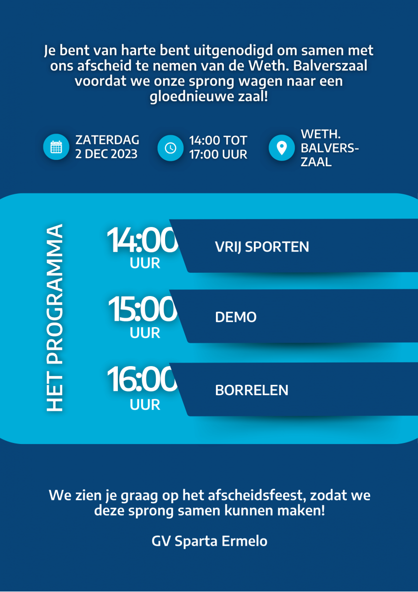 Met de komst van Sportcentrum De Zanderij sluit Sparta Ermelo een hoofdstuk af. Daarom nodigt de gymnastiekvereniging alle leden en oud-leden uit om op 2 december samen op gepaste wijze afscheid te nemen van de Wethouder Balverszaal.