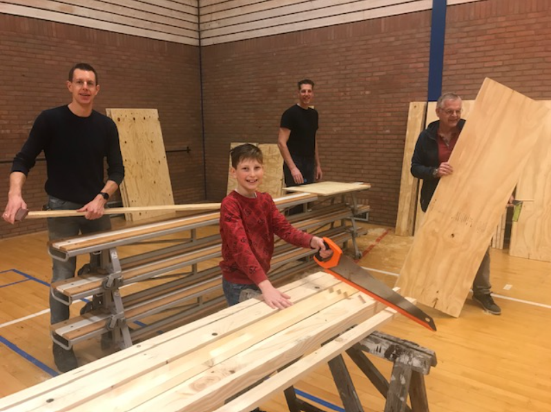 Met tekeningen van sporttechnisch adviseur René Linthuis gingen de vijf vrijwilligers gezamenlijk aan het werk.