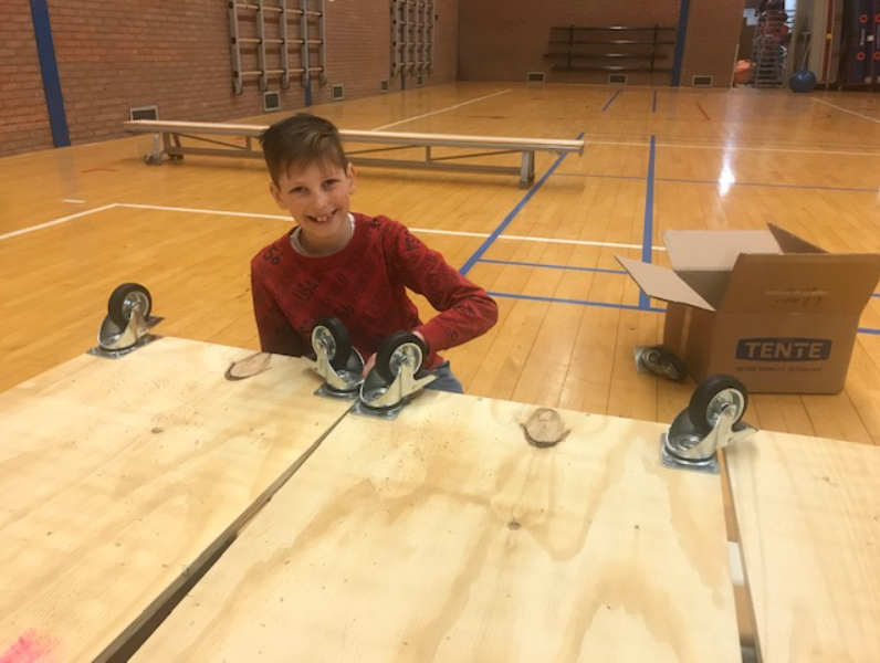 Tenslotte Albert-Jan Knol, vader van turnster Mirthe. En ook de broer van turnster Monica, Hugo (9), helpt een handje mee en monteert de zwenkwielen.