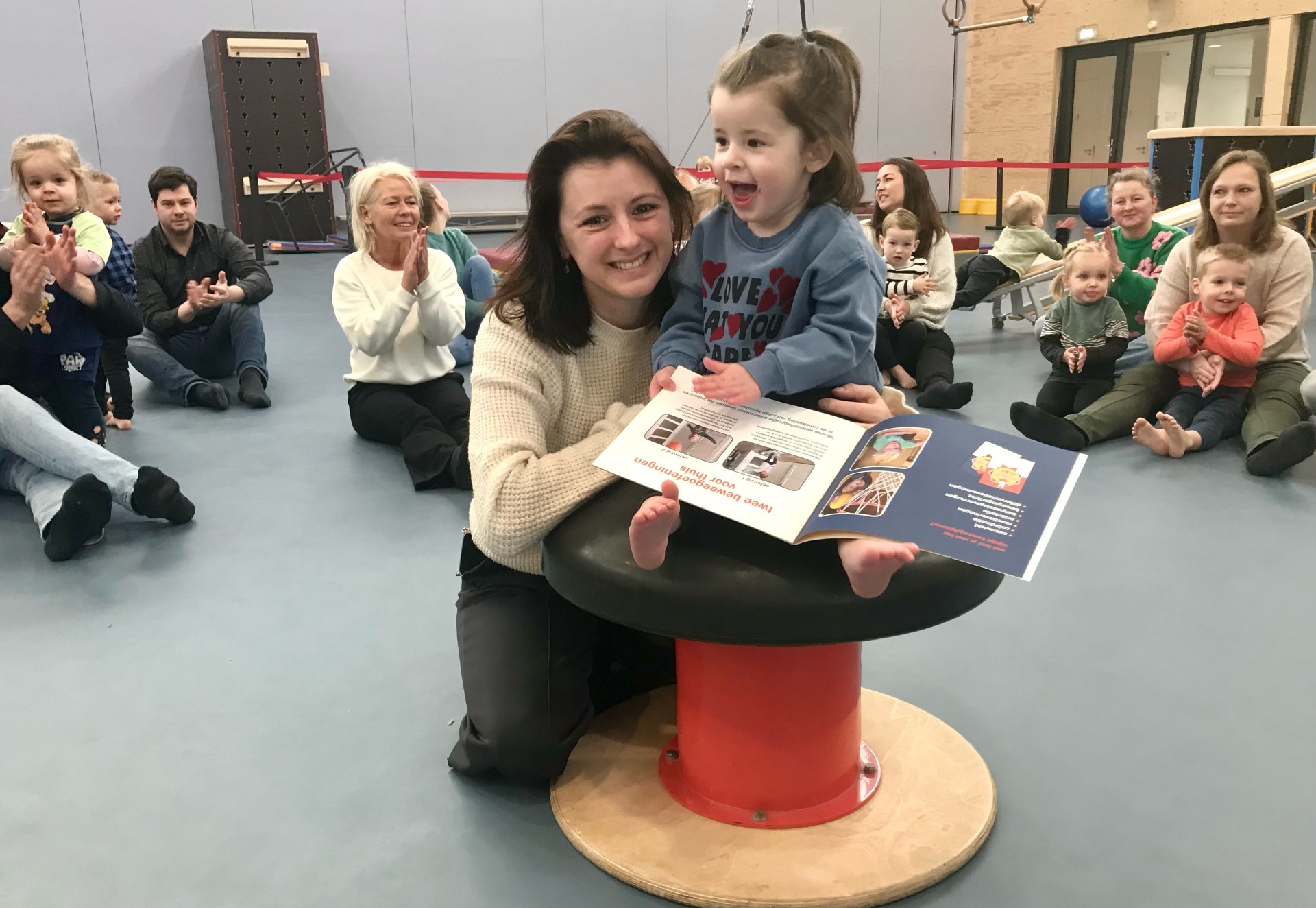 Ermelo - Zaterdag 9 maart is de 2-jarige peuter Lucie Guérin met mama Laura begroet als 100ste gymmer bij de peuter- en kleuterafdeling van SPARTA. Ze mocht op de paddestoel zitten en het nijntje Beweegboek in ontvangst nemen. Het is in de gymsportzaal van Sportcentrum Zanderij elke zaterdag een drukte van belang. In vier groepen komen de kinderen samen met een (groot)ouder deelnemen aan het nijntje Beweegprogramma voor 2 t/m 5 jarigen. Ze leren daar alle basisvormen van bewegen op een speelse en uitdagende manier aan.