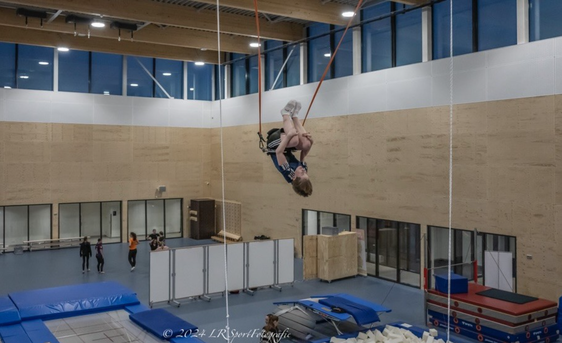 Jeugdspringer Twan Rieksen zal de officiële openingsdag van Sportcentrum Zanderij nog lang heugen. Tijdens de ochtendtraining verlegt hij een belangrijke grens. Voor het eerst in zijn leven springt hij zonder vanggordel een treffis, een drievoudige salto met halve draai. De foto is van eerdere datum. Dan zit hij nog vast in de veiligheidsgordel. Maar zaterdag 6 april is hij er mentaal klaar voor en doet zijn eerste geslaagde poging zonder gordel. Moedig en knap.