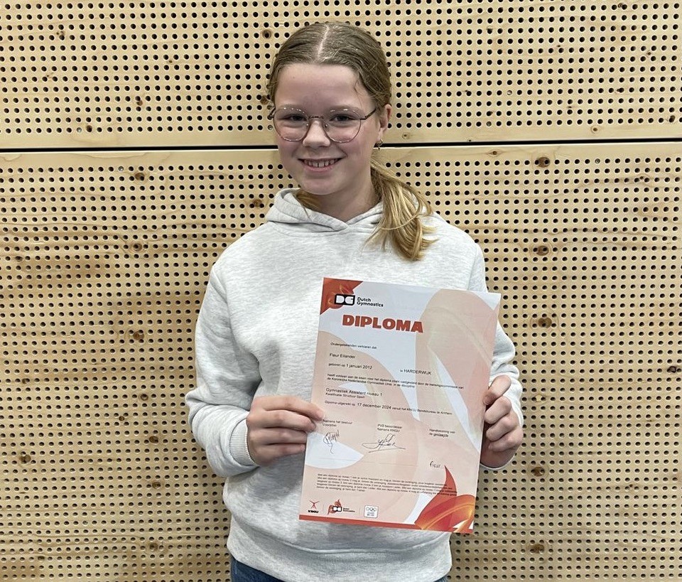 Turnster Fleur Eilander heeft op vrijdag 20 december het diploma Gymnastiek Assistent niveau 1 uitgereikt gekregen van haar praktijkbegeleider. Fleur heeft dit jaar geassisteerd bij de turngroep meisjes 9 tot en met 11 jaar. Voor de zomer bij trainster Sandra Rakhorst en na overdracht in de zomer bij Hans van Zetten. De opleiding omvat 19 praktijkopdrachten, waarvan de uitvoering moet voldoen aan de methodische en sporttechnisch eisen van de turnsport. De praktijkbegeleider beoordeelt dat.
