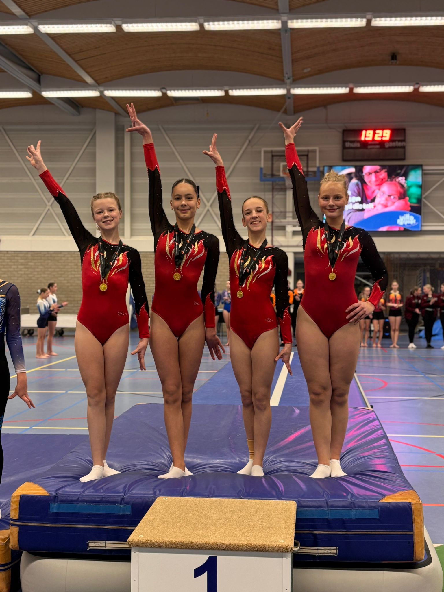 Het nieuw samengestelde team, bestaande uit Fleur Eilander (jeugd), Britt de Mots (jeugd), Sharayah Jerusha de Hoop (junior) en Tara Ruitenberg (senior), wist met bijna 10 punten verschil de overwinning te pakken: 129.750 tegenover 119.850. Een indrukwekkende prestatie, vooral gezien de zenuwslopende start op de balk. Maar ondanks de spanning bleven de turnsters gefocust en gaven ze alles op de overige toestellen.