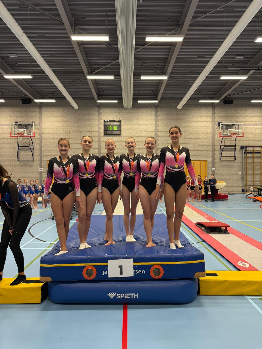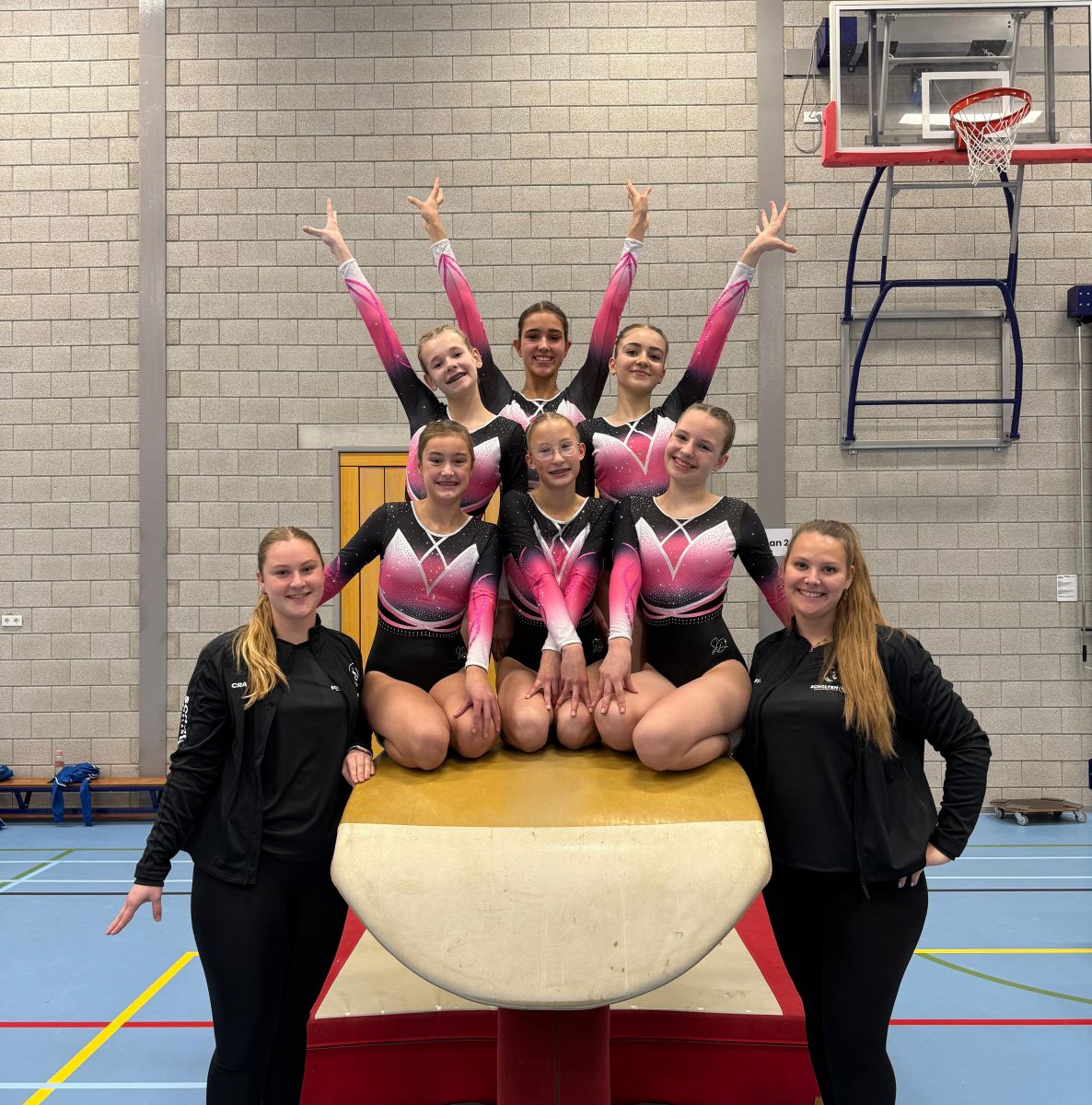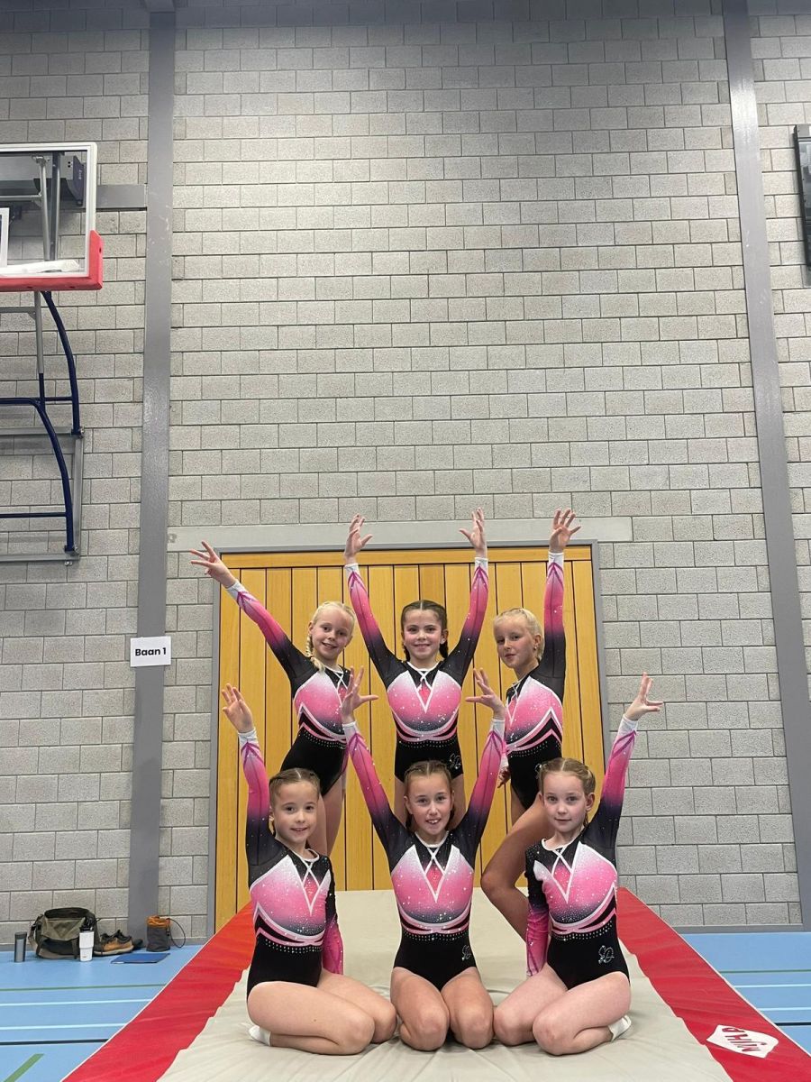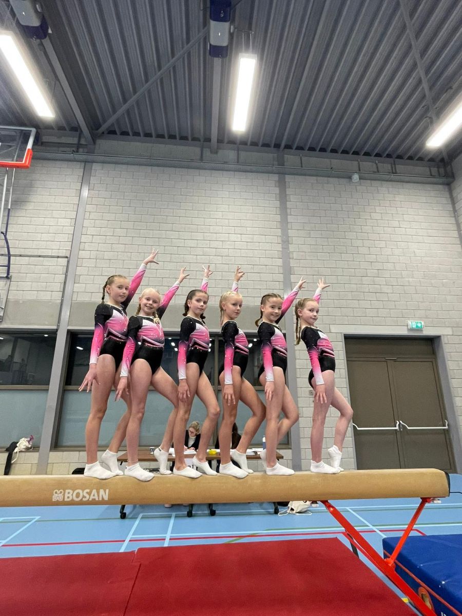 Voor vier van de zes turnsters van middenbouw niveau 6 betekende dit ook hun allereerste wedstrijd ooit. Het team bestaat uit Saydee Schouten, Loïs Mulder, Vera van Loo, Julia Bakker, Elisa Wiedenhoff en Nora van Vuuren. Extra bijzonder deze wedstrijd, was dat de turnsters voor het eerst mochten turnen in hun mooie, nieuwe wedstrijdpakjes. Ze zagen er supermooi uit!