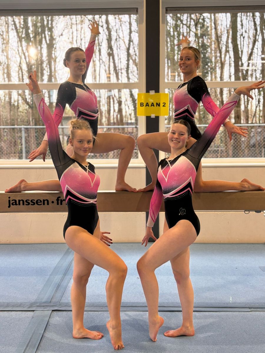 Foto: op de balk: Ilse Koops (links) en Aimee van der Sluis (rechts), voor de balk: Tara Ruitenberg (links) en Isis Kremer (rechts), eigen foto