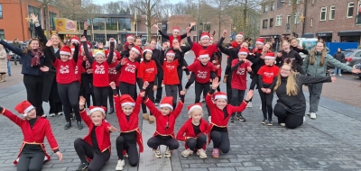 Dansers stralen in kerstoutfits tijdens kerstmarkt